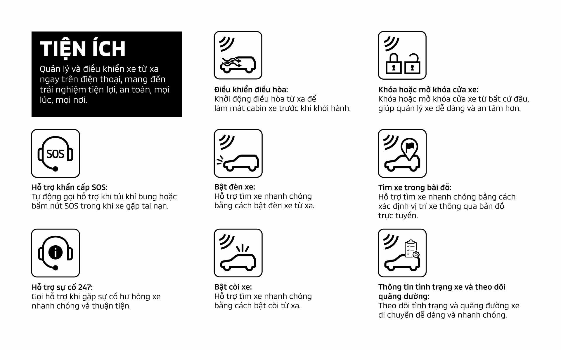Trong trường hợp tai nạn và bung túi khí, hệ thống trên xe sẽ tự phát hiện và kết nối với tổng đài Hỗ trợ Khẩn cấp 247.